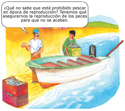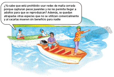 Platique con sus compañeros, familiares o amigos sobre los dibujos de prácticas pesqueras inadecuadas, y comenten qué pasará con muchas especies si se continúa pescando de esta manera.