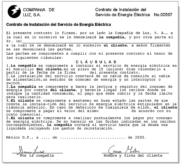 Vea el ejemplo de un contrato de luz e identifique la información básica que debe contener un contrato. Escríbala en el espacio correspondiente. Coteje sus respuestas, presionando el botón indicado e imprímalas.